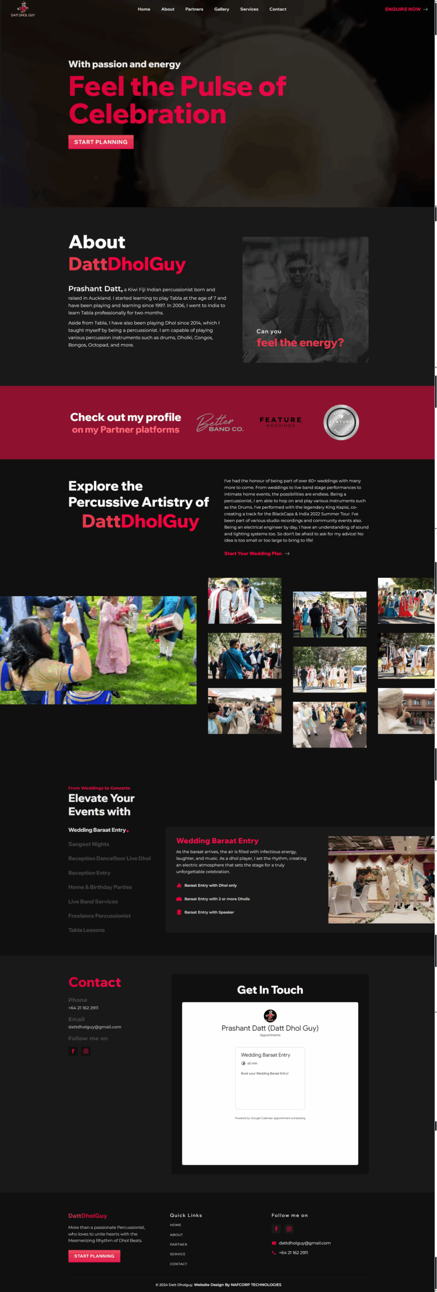 “Dattdholguy” is a dynamic portfolio website tailored for an incredibly talented percussionist who specializes in captivating audiences at weddings and events with the vibrant beats of the dhol. This project aims to showcase the artist’s exceptional talent, energizing performances, and a portfolio of unforgettable moments.