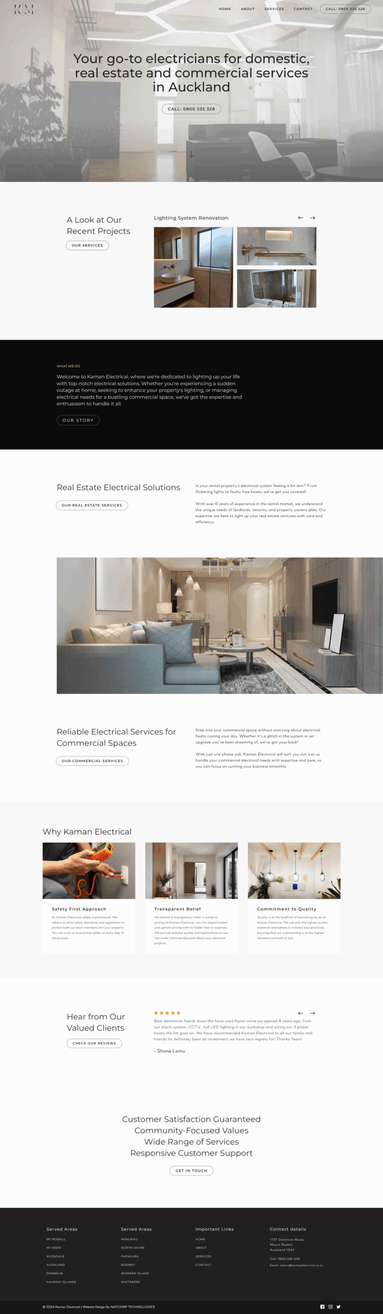 Nafcorp designed Kaman Electrical to a modern, user-friendly website that highlights their wide range of electrical services for real estate and commercial spaces in Auckland, New Zealand. Kaman Electrical specializes in lighting system renovation, upgrading electrical switches and circuits, and installing kitchen electrical appliances, providing reliable and efficient solutions for both residential and business clients.